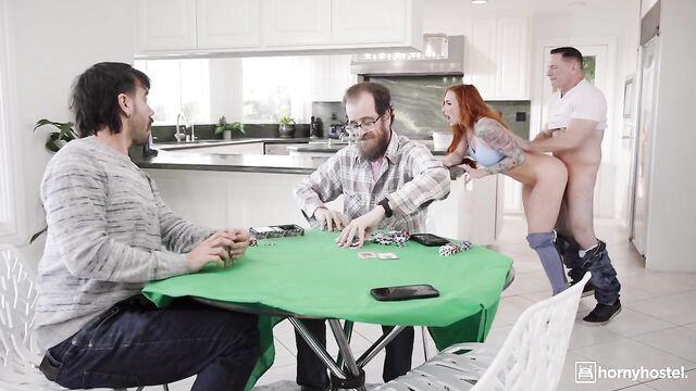 Description: Sophia Locke hosts a poker night for her husband and his friends, John Strong and Nade Nasty. As the game begins, she kneels under the table, teasing John’s cock with her lips while her husband brags about his winning hand. Later, she lures John to the kitchen, bending over the counter for a quickie. Returning to the game, Nade - now broke - follows her to the bathroom, where she rides him against the sink, muffling moans as her husband cheers his luck. The men leave smirking and her husband gloats about cheating a little that night... and he's not alone.