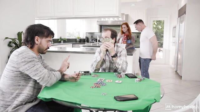 Description:Sophia Locke hosts a poker night for her husband and his friends, John Strong and Nade Nasty. As the game begins, she kneels under the table, teasing John’s cock with her lips while her husband brags about his winning hand. Later, she lures John to the kitchen, bending over the counter for a quickie. Returning to the game, Nade - now broke - follows her to the bathroom, where she rides him against the sink, muffling moans as her husband cheers his luck. The men leave smirking and her husband gloats about cheating a little that night... and he's not alone.