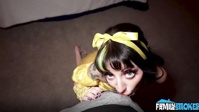 Description: Dressed in the slutiest princess outfit, Kitty sits alone in her red-lit bedroom, taking a breather from the Halloween party her stepbrother Austin threw in their house. She was captivated by a mysterious masked man who had been watching her all night. Her deepest and darkest fantasies soon become real when the mysterious character enters the room. Drawn to him, Kitty gives him a kinky moment to remember her until someone interrupts the moment. After the chaotic Halloween party, Austin and Kitty wake up chained together in a strange, empty house with an old, flickering TV. A creepy character pops up and tells them that their lives depend on what they do next. If they want to get out of there alive, they must follow her crazy instructions. Forced into vulnerability, the two confess secrets to each other while masturbating together, hoping to get rid of this maleficent presence once and for all.