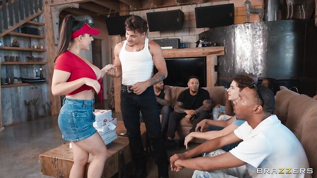 Description: Angela White is the hottest pizza delivery woman in the world, and today she is bringing the goods to a bunch of hungry bros. She realizes one of the guys is a former fling and, feeling horny on the job, sneaks off to give him a blowjob in the kitchen. Soon the other guys find them, just when she's ready for more cock. Enjoy this piping hot blowbang from porn star legend Angela White!