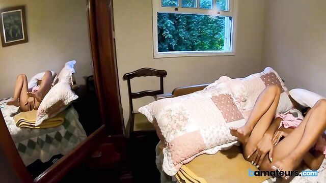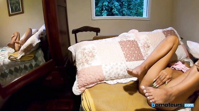 Description:Gorgeous tanned brunette with long hair and sexy arm tattoo sprawls on the bed facing the mirror. Her big natural tits bounce as she spreads those smooth legs wide, showing off perfect tan lines and a shaved pink pussy. She slides her fingers in slow, then faster, moaning while watching herself get wetter. Little tattoo on her body peeks out as she rubs her clit hard, hips bucking until she cums with shaky legs. Still breathing heavy, she slips her tiny panties back on, pulls up tight short shorts over that juicy ass, and gives the mirror one last naughty smile.