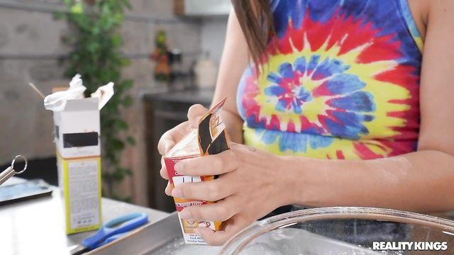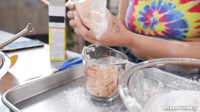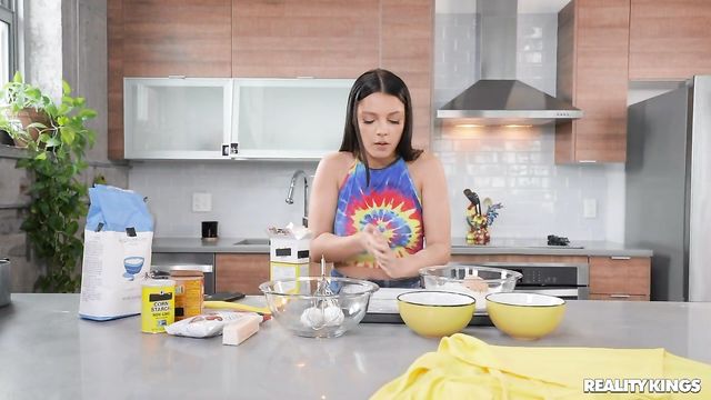 Description: Perky brunette Ella Cruz is recording another episode of her cooking show, demonstrating how to bake chocolate chip cookies to all her fans, but her boyfriend Sean Lawless keeps intruding into the shot! When Sean gets on the counter with his hard cock in her face, Ella swallows it and decides the cookies can wait. The pair fuck on the couch, but Ella's ingredients don't go to waste as Sean oils up her delectable body!