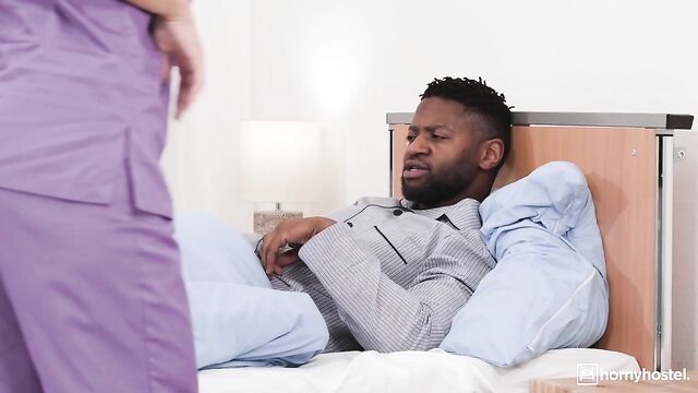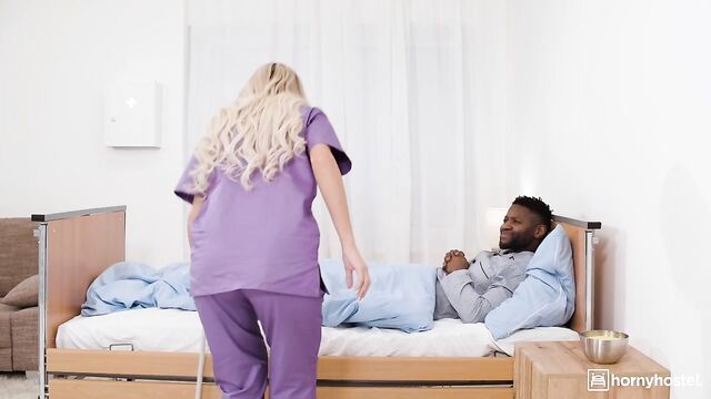 Description: As Ema tends to Freddy's needs, his roaming hands find their way to her voluptuous form. She feigns resistance, but behind closed doors, Ema's fingers herself, unwittingly putting on a show for the observant Dr. Mandingo. The plot thickens when Freddy summons Ema for a sponge bath. His touch ignites her passion, but she sends him off to the bingo game. Nelson seizes the opportunity, disguising himself as a patient to get a taste of Ema's naughty nursing skills. As she searches for a "missed spot" under the sheets, she's in for a surprise: Nelson's massive black cock, begging to be sucked. Freddy returns, and Ema invites him to join the party. The two big black cocks take turns filling her up, covering her face and tits in cum.