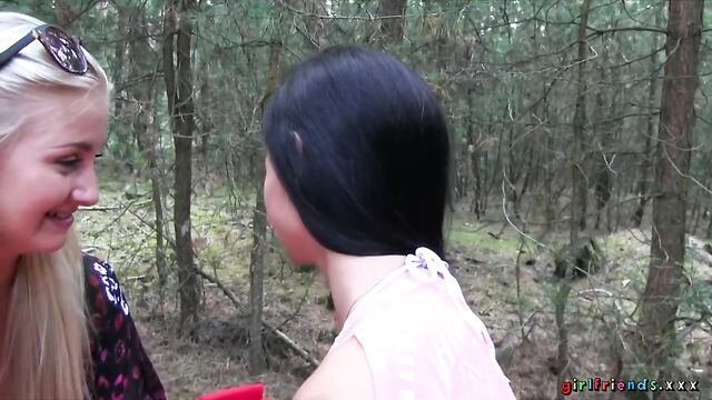 Description:The girls, continuing with their day at the lake, venture in to the unknown surrounding of the nearby woods! They quickly get tired of rambling aimlessly and find a nice spot to put down their blanket. Keira wants to have another taste of Kayla