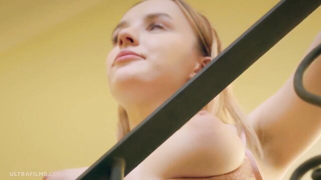 Blondie with perfect natural tits Polly Yangs stimulates her snatch