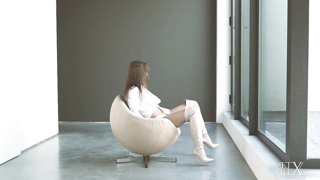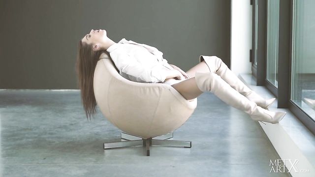 Description: Sexy brunette Sabrisse A looks sizzling hot in thigh high white boots. With a sassy smile, she unbuttons her shirt to reveal her slender body, running her hands over her erect nipples and into her white cotton panties to touch her pussy. Breathing heavily, she tugs her panties aside as she rubs her clit, then takes them off altogether so she can masturbate with both hands, driving herself to an explosive orgasm. Her cute, bashful smile says it all…