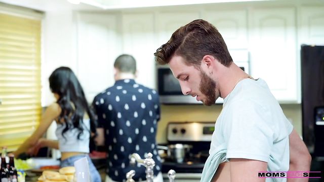 Description: Katya Rodriguez and her dad are preparing a dinner so her parents can meet her boyfriend Lucas Frost. When Lucas knocks, Katya's stepmom Tia Cyrus answers the door. The second she lays eyes on Lucas, though, Tia knows she needs to have him. The moment Katya's back is turned, Tia drops to a crouch and whips out Lucas's cock so she can suck his big shaft. Putting her big knockers together for a titty fuck, Tia is in the process of working Lucas into a sexual frenzy when Katya spots them. It takes some fast talking, but Tia convinces Katya to join them instead of ratting her out. Soon Katya is happily sucking away at Lucas's cock as her stepmom rubs her tits. When Tia settles on the bar stool with her skirt hiked up, Katya leans forward to feast on her stepmom's pussy. Meanwhile, Lucas slides into her from behind to deliver a proper pussy pounding. Not to leave Tia out, Lucas steps up to fuck her landing strip snatch as well while Katya makes sure to muffle her stepmom's moans. Moving to the floor, Lucas lays down so he can play stud to both lovely ladies. Katya slides back down to give him a full-on stiffie ride in her bald pussy, while Tia sits on his face so he can feast on her creamy fuck hole. Then the girls switch it up to ensure that they're each fully satisfied. Only then do they each get on their knees so that they can take turns sucking and stroking Lucas's hardon until he delivers a facial to each of them.