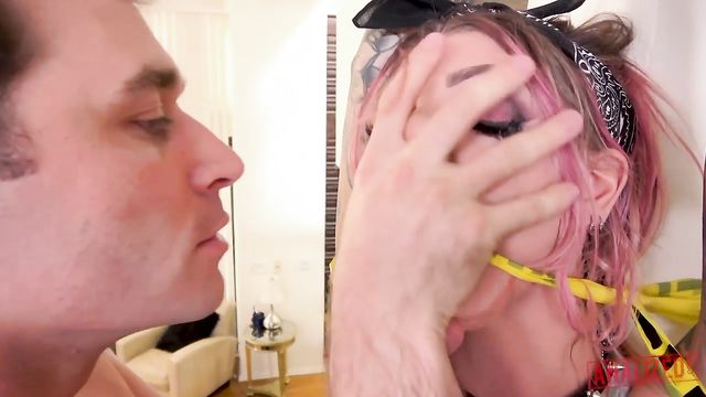 Description: Karma Rx is a tattooed beauty with massive tits and an incredible ass. She's the kind of girl who fucks with her Doc Martin boots on and everything else off. Today she finds herself very horny and tied up and gagged with yellow caution tape. That's when a young, hung stud with a big white cock finds her. She's ready for everything today. She wants a rough fuck in her tight little asshole and she wants it right now! When the shirtless stud finds her he immediately unties her, only to bend her over and begin using her holes. He licks her ass and then makes her choke and gag on his big cock through a metal railing. She gags so hard there are tears in her eyes and her makeup begins to run, but all she wants is more. He puts her on her back and goes straight for her asshole, stretching and pounding the little hole until it's wide open and gaping. He bends her over on all fours and takes her tight little asshole again from behind. He puts his foot on her head while his huge cock gives her the rough anal fucking she craves. Next he takes his cock out of her ass and puts it in her ass, making her taste the ass to mouth, before bending her over once more and plowing her asshole again. When she can't stand it anymore he sits on the couch and she lowers her ass down on his big white cock, riding his dick reverse cowgirl up her gaping asshole. Finally, he is ready to cum, he pounds her asshole over and over before cumming all over it in a hot white, sticky cumshot that glaizes her ass.