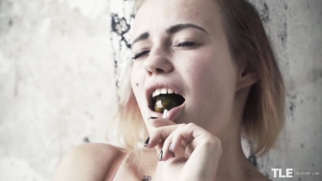 Description: Hot Angelina A – a sassy tattooed babe from Belarus, with a blonde-tipped brunette bob and a beauty mark on one cheek – is taking a barefoot walk outdoors. Dressed in just a revealing pink babydoll top and high-cut white lace panties, she’s carrying a duffel bag and sucking on a couple lollipops. She wanders through the long grass and weeds near some derelict buildings, then takes a break in the shelter of a large, arched concrete tunnel. Sitting splay-legged on her bag on the dirt floor, she enjoys her sweet treat and begins to rub her pussy through her underwear. She soon pulls the crotch aside to reveal a shaved pussy and starts to masturbate with manicured fingers, still sucking on a lollipop. She peels off her panties and continues to pleasure herself, a look of ecstasy on her face as she swirls her pierced tongue around the sweet, hard candy and spins it against her full lips. Moaning rhythmically, she rubs her clit and slides two fingers inside. Next, she runs one of the drool-wet lollipops down the front of her body and circles it over her fleshy pink slit, before slipping it in her snatch. She pumps and grinds the jewel-green candy inside of her, while sucking on the other. She raises her ass clear of the ground, rocking and squatting on her tiptoes, smearing her entire slit with pussy juices as the camera homes in for a close-up. She reaches behind each thigh to vary the angle, then brings the second lollipop down to tease her clit as she screws her snatch with the first. Her cries become louder and more urgent until, at last, she cums, letting one lollipop fall into the dirt as she relaxes and caresses her curves…