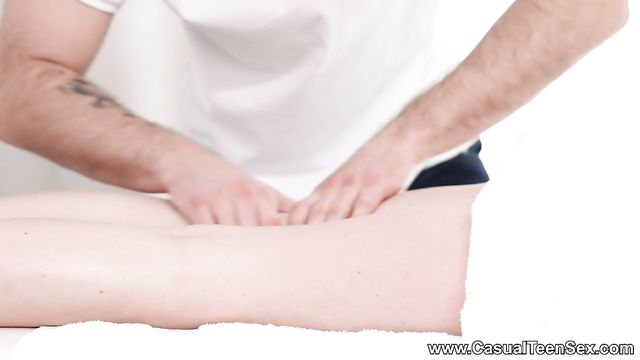 Description: This gorgeous slender teeny always chooses to get her massage fully naked and now you know why. She knows her handsome masseur just won't be able to resist the temptation to give her extra special massage twitching her horny nipples, fingering her well-oiled pussy and eventually fucking her good right on a folding massage table. Deep, intense and sensual internal massage with powerful orgasm is just what this teeny needs to make her day. Bravo!