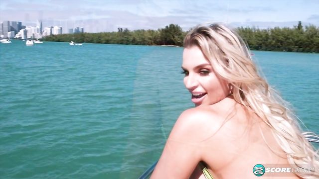 Description: Sexy stunner Katy Ann is a dancin' machine on the good ship SCORELAND as it cruises the waters, the skyline of Magic City Miami in the background. The weather cooperates and the sun isn't blocked by cloud cover as if it knows Katy Ann is here from Texas. Regular boaters in the area see a lot of bouncing swimsuit babes in their travels but have they ever seen anyone as stacked and shapely as Katy Ann? She does justice to cut-off denim shorts. "My boobs are soft and squishy," Katy Ann said. "They feel a bit firm. These are not rock hard at all. They have movement. They just feel pillow-soft. They feel great, like a nice, firm pillow. "When I work out, I need three bras, two sports bras and a heavy duty support bra. I don't want them to bounce. Some guys will say, 'What do you mean you don't want them to bounce?' because they definitely have movement." All bras were off for this boat trip. Katy Ann's monokini top slipped off 40 seconds into her on-deck bouncing dance party. Good times.