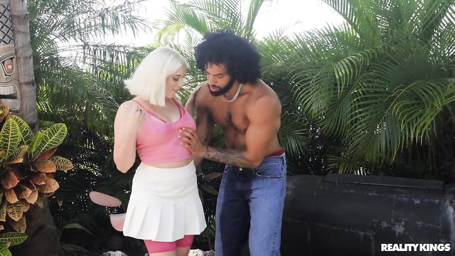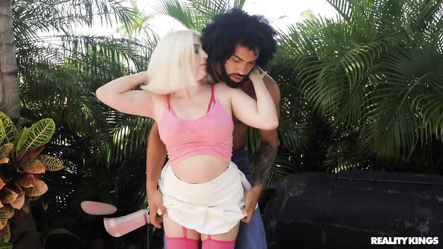 Description: Horny blonde Gia OhMy can't help but stare as her hot neighbor James Angel takes his shirt off while cutting down some coconuts. Gia quickly nips inside to slip into some hot pink lingerie and a cute outfit before bringing James some water, and she gets his attention on HER coconuts instead! Gia sucks James's cock, then brings him inside where she strips down to her bra, stockings, and garterbelt to get that dick like she's been fantasizing about. Gia cums as she rides James, then holds a toy on her clit as he pounds her pussy, enjoying every inch of that big rod before she takes a facial!