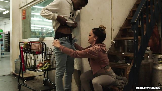 Description:Damion Dayski is trying to be sneaky as he films hottie Leila Larocco's sexy tits and tight ass in her workout clothes at the grocery store, but he's not sneaky enough, because Leila catches him looking. That just makes her start teasing him on purpose, tipping him a huge wink after teasing him with produce, then pulling down her leggings to shake her bare ass at him! Leila takes out her tits, then leads him to the back of the store where she sucks his cock, fucks him and takes a facial!