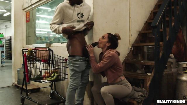 Description: Damion Dayski is trying to be sneaky as he films hottie Leila Larocco's sexy tits and tight ass in her workout clothes at the grocery store, but he's not sneaky enough, because Leila catches him looking. That just makes her start teasing him on purpose, tipping him a huge wink after teasing him with produce, then pulling down her leggings to shake her bare ass at him! Leila takes out her tits, then leads him to the back of the store where she sucks his cock, fucks him and takes a facial!