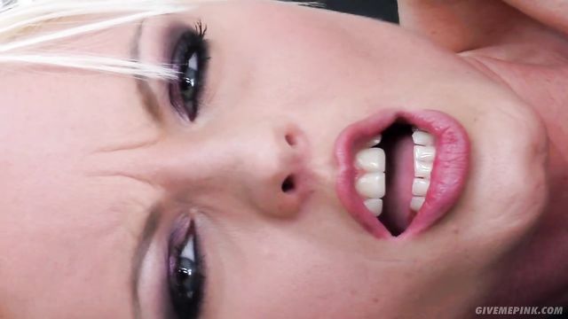 This blonde cuties shows off her sexy body and begins to masturbate. She slides a big dildo in and out of her super wet pussy.