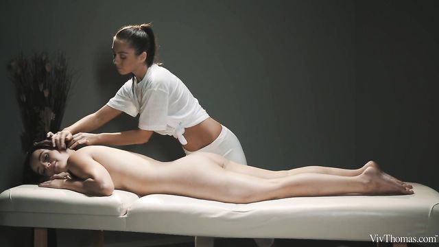 Description: Gorgeous brunette Petra F strips naked, ready for her session with sexy masseuse Sabrisse, as episode three of Nik Fox’s erotic movie series "Full Body Massage" begins. She perches on the massage table wrapped in a towel until Sabrisse removes it – revealing her big natural breasts – and gets her to lie face down and relax. The masterful masseuse looks so demure with her hair up in a ponytail as she caresses the full length of her client’s body, before pouring oil on her back and massaging it into her silky-smooth skin. Petra sighs with pleasure as Sabrisse kneads her back and trails her magic hands over her ass, working the oil into her cheeks and crack, and running her fingertips tantalizingly over her puckered hole. Sabrisse instructs Petra to roll onto her back and she repeats the process to her front, massaging the oil into her beautiful breasts, causing her nipples to stiffen rapidly. As Sabrisse’s oily hands glide over Petra’s slick body, she leans forward and starts kissing her passionately, slipping a hand between her legs and working her fingers in and out of her shaved pussy’s glistening folds. Petra floats in a dreamy state between relaxation and arousal, but she snaps out of her blissful trance when Sabrisse takes off her tight yoga pants and straddles her on the table. The horny masseuse pours oil over her top and rubs her body against Petra’s, stroking her pussy as she writhes on top of her. She gets naked, her tanned body shining with oil, and goes down to finger-bang Petra’s slick slit. Turning around into a sixty-nine, Sabrisse grinds her pretty pussy down on Petra’s mouth, moaning out her pleasure as her new lover’s tongue dips inside her. Petra goes face down, ass up for Sabrisse to frig her to orgasm, then makes her irresistible masseuse climax on her slippery fingers, leaving them both smiling and sated.