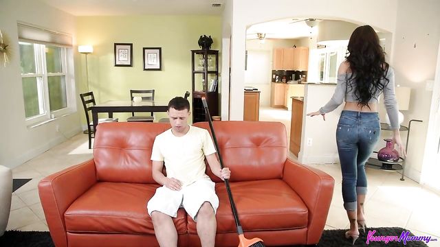 Description:Crystal Rush knows her stepson Johnny is a little pervert. He keeps creeping on her so he can watch her tits and ass as she does housework. Crystal isn't that much older than Johnny, but she's his stepmom so she tries to deflect his interest by insisting he do some housework, too. Johnny doesn't actually do his chores; he just gets more creative. Instead, he goes to hide in the closet so he can keep on perving on Crystal.Later, Johnny is in the shower jacking off with some sponges when Crystal finds him. That's the final straw. Crystal takes Johnny by the dick and leads him to the living room where she shoves a broom at him and tells him to make himself useful. Instead, Johnny winds up humping the broom. Crystal cannot believe her eyes! Shoving her own pants down to expose her landing strip snatch, she demands to know whether this is what he wants. He says yes, so Crystal grabs his hair and shoves his face right onto her clit. Johnny is surprised, but he goes with the flow and goes to work eating his stepmommy out. He gets to enjoy Crystal's big titties, too.Shoving Johnny onto the couch once again, Crystal climbs onto him and puts her breasts back into his face as she rides him in cowgirl. That ball slapping fuck fest gets even faster as Crystal turns around to gov for it in reverse cowgirl. Crystal gets on her knees to let Johnny fuck her face, then curls up with her stepson on the couch as he spoons with her and fucks her from behind. Johnny has one last position in him, so Crystal gets on her knees and humps his cock as she leans forward over the back of the couch. Eventually Crystal lets Johnny take the reins in true doggy, which brings him right to the edge of his endurance. He pulls out just in time to nut all over Crystal's face. There's no time to enjoy the afterglow, because Johnny's dad will be home soon and Crystal still has so much cleaning to do.