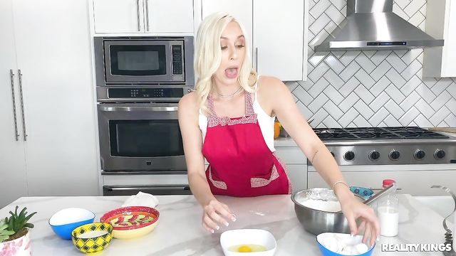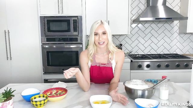 Description: Johnny The Kid promised to help his beautiful blonde gf Kay Lovely bake cupcakes for her vlog livestream, but when the time comes, he just wants to watch the big game. Kay employs all her powers of persuasion, sliding her big tits out from under her apron, to entice her man to help. When Johnny gets down to pick up a dropped whisk, he decides to get a taste of Kay's cake, motorboating her booty and then pulling down her shorts to eat her pussy. Kay takes her revenge by putting Johnny in charge of stirring while she gets down behind the counter to suck his cock. Soon this pair are making a mess in the kitchen as Johnny pounds Kay's pussy, then he shoots his frosting all over her tits.