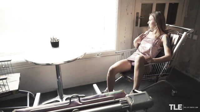 Description: Sexy Lara A, a tattooed babe with cute braces and light brown hair, is sitting alone at a window table in a small, quirky cafe – the chairs are made from shopping carts. In a naughty mood, she splays her thighs so her minidress rides up to flash her black and pink thong – yet no one passing by outside seems to notice. Slowly and deliberately, she massages her breasts, popping one out briefly to tease her nipple. Then her hands wander to her crotch. Switching the focus to self-pleasure, she rolls the chair back to a more discreet spot and plays her fingers over her panty crotch, pulling it aside to finger her shaved pussy, stroking and circling her clit, then teasing herself through the fabric once again. She writhes in her seat, moaning loudly, then peels off her dress and stands up to remove her panties, before kneeling on the chair, naked and barefoot, to reach back and plow herself doggy style. The camera zooms in for a close-up of her firm, tight ass as she sinks one finger, then two, inside of her snatch to the knuckle – and all the while, people pass by outside, oblivious to the horny scene playing out just feet away. Next, she perches on the back of the cart, with her pointed toes resting on the arms. Flaunting her taut belly and with her thighs splayed wide, she continues to frig herself. As one hand caresses her perky breasts and caramel-pink nipples, the other delves deep inside of her wet hole. After a while, she switches focus to her clit, scissoring two wet digits on either side of it, building up friction. She gets down off of the chair and twirls, showing off her perfect, slender curves, then bends over, standing doggy-style. Her fingers are drenched as she pounds them in and out, churning up her juices. Finally, she sits on the floor, not knowing or caring whether she can be seen as she fingerbangs herself into a frenzy, cute braces on display as she bites her lip in ecstasy. Her moans of pleasure turn to yelps and cries as she cums, then she writhes on the floor, playing with her tits as she enjoys the afterglow...