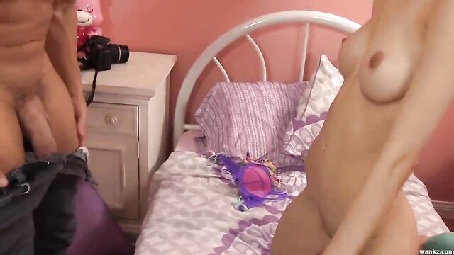 Description: A girl in purple panties and bra is lying on her bedroom bed. She is a skinny brunette with a great rack. An older guy walks in on her. She proceeds to do it all. She sucks him, then goes do cowgirl style. She then does it doggy style for her older guy, spread eagle, and reverse cowgirl. She ends up with his splash all over her face. She has a nice heart-shaped ass. He pulls her hair a little bit. She sucks his dick like a hot little slut. She looks really cute on her little bed. Watch her face as she can barely take his dick, but this girl knows what she wants and is going to get it.
