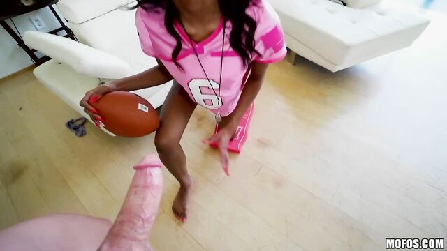 Description: This ebony babe Nia Nacci was riding high from her fantasy football win, but it was her bf who got the real spoils of victory when she took out her big tits, gave him a blowjob, and then took his big cock deep inside her pink pussy!