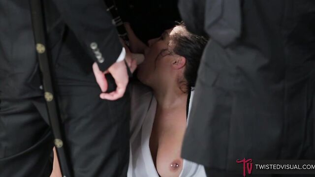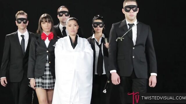 Description: Pretty babe London Keyes, together with Dana DeArmond, Dana Vespoli, Chad Diamond, and Wolf Hudson, walk slowly toward the camera. The boys are wearing a tux while the girls are wearing what seems to be a school uniform. On the other hand, London is wearing a sacrificial robe. The gang comes to a halt. The others surround London. London gets on her knees to suck the boys’ cocks and the girls’ strap-on dildos. She is completely surrounded by real dicks and fake cocks. London tries to suck all of them one by one. Her mouth is constantly kept busy. The gang keeps their dicks close to her face. Her two hands and mouth are not enough to please all the cocks. She continues to ravage their big cocks, their dicks slide deeper into her mouth as she allows her throat and mouth muscles to relax. The sausage fest is just starting. The group laugh at her and spit on her face, but she loves the humiliation; London’s face is now covered in spit. They all take turns shoving their cock into her mouth. Her lips and tongue are constantly moving around. She tries to fit two cocks into her mouth. Dana dunks London’s face in ice-cold water. She strokes London’s neck while she is deepthroating a cock. The blowbang fest gets wetter and messier by the moment. Her face is starting look like a wet rag doll. The gang is not yet satisfied. They jam their cocks into her throat. London turns around as she sucks them in close succession. There is no moment of rest for this little whore. The crew keeps on taking turns inserting their hands, cocks, and dildos into her mouth. They throat-fucked London and dunk her in water until she is gasping for breath. Her labored-breathing echoes throughout the room. London can’t help but groan, moan and scream every time a cock pulls out of her mouth. She is totally overwhelmed by the cocks right on her face. After the wet and messy blowjob fest, the guys shower London with their warm cum. Her face is now full of spit, cold water, and warm cum. They made her into a complete cum basket. They clean her face with ice-cold water.