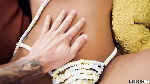 Description: Evelin Stone has a special surprise for her man: a candy thong bikini that he can eat right off of her! He feasts on that sweet treat, eating her pussy until she's ready for a BJ and some awesome reverse cowgirl action!