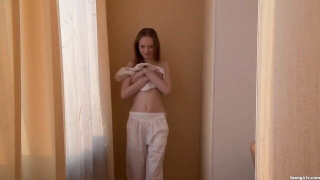 Description:Sometimes you just gotta kick back and bask yourself in pure teen beauty by way of this scintillating solo show by the beautiful Bonnie. Our milky skinned tramp prances delicately on the tips of her toes along a hallway illuminated by smooth morning light. Wearing a white blouse and lounge pants, she only needs to bat one of those eyelashes to grab your attention. Her fierce green eyes do well to complement her thin, natural teen figure. Titties you could suck on all afternoon and slender legs as long as the day is hot.