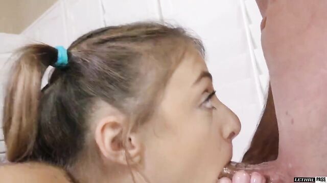 Description:Hot blonde in a sexy outfit shows off her hot perfect booty. She gets on the bench for a nice massage action. She moans as he rubs the booty cheeks real good. She loves getting it in her ass hole and some fingering action too. She gets on her knees and his cock finds her throat. She gobbles it real good and gets on her back for a nice hammering. She moans as her pussy drips wet for some good thrusting action. She loves tossing some salad and gets down to work it hard. She moans and gets it in deep in doggy style motion,. She loves getting it all the way in.