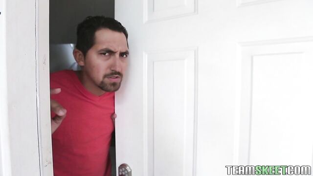 Description:Tatted up and tiny Natalia Mendez got into some with the cops and was running for her life, and innocence, when she ran into a strangers home. This guy thought it was a prank - until he opened the door and heard the sirens! Panicked he rushed her into the kitchen and stuffed her into a cabinet, where she hid, until he managed to get the cops to scram. This modern day hero felt he deserved a reward, and Natalia said she would do anything, so he whipped out his swollen cock! She blew him while in, and out of, the cabinet and then petite Natalia got bent over and drilled in the kitchen! As a final act of thanks, Natalia took a huge load of ball sauce all over her pretty mouth and face and this mini criminal was on her way! I wonder what she did...