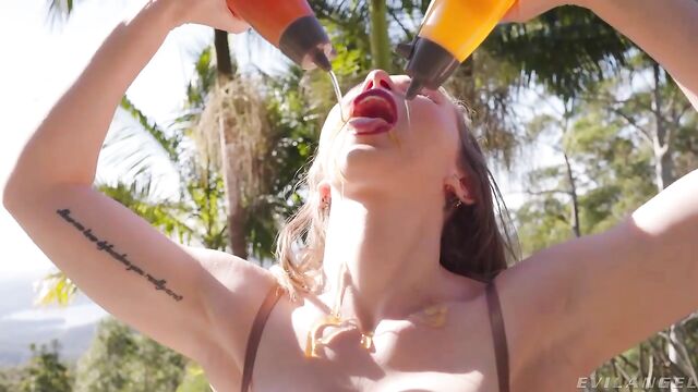 Description:Exculsively for EvilAngel.com members: Naked but for a teddy bear-themed bikini, stockings and high tops, buxom stunner Scarlet Chase plays in the woods, twerking and stripping, spreading and jiggling her amazing ass. In bright sunshine, the pale, longhaired blonde douses herself with honey, pouring golden goop all over her fine body. The sticky treat collects in her deep cleavage. Scarlet rubs honey into the crack of her shapely butt and into her bald twat. Her fingers penetrate her pussy. When she pumps honey into her rectum, her winking sphincter squeezes out streams of the messy stuff. With three fingers jamming her bunghole, her cunt ejaculates a fountain of orgasmic squirt! Bearded Elic Chase appears, naked and hard. Scarlet gives a honey-slathered blowjob, and she wallows lewdly in sweetened spit. She lies on a picnic table, gasping, masturbating and squirting girl geysers as Elic's boner fucks her bunghole. He palms her round rear cheeks as she takes a honey-glazed anal ride. Scarlet gives ass-to-mouth head. A cum facial slops her from eyes to tongue to tits!