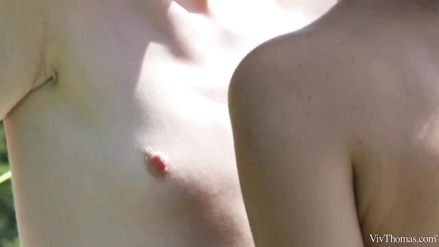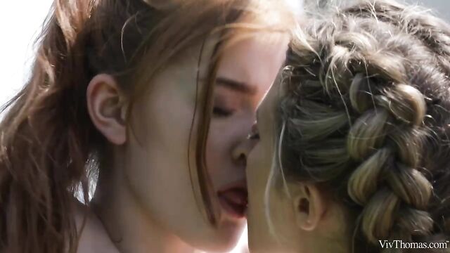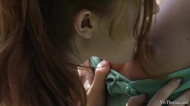 Description: Cute sexy girlfriends Jia Lissa and Kalisy get frisky playing backyard volleyball, as episode four of Sandra Shine’s erotic series "Summer Fun" begins. Having kissed through the net, Kalisy leads Jia to a nearby chair, tugs down her bikini top and sucks the rosy pink nipples of her lovely small breasts. The stunning redhead is soon perfectly naked, with Kalisy flicking her tongue up and down the slit of her juicy pussy with its natural red bush. By the time Kalisy replaces her tongue with probing fingers, Jia is so aroused she lifts her ass off the chair to enable her lover to thrust at full throttle, driving her to an orgasm that makes her whole body quiver. They gaze amorously into each other’s eyes and kiss passionately, before adorable Kalisy sits naked in Jia’s lap, ready for some romantic attention. Jia strokes and finger-bangs her unshaven pussy, then kneels to eat it voraciously. Kalisy grinds on her sweetheart’s pretty face, head thrown back in ecstasy as she climaxes noisily. The two beautiful girls kiss through the afterglow lovingly, their "Summer Fun" definitely not over just yet.