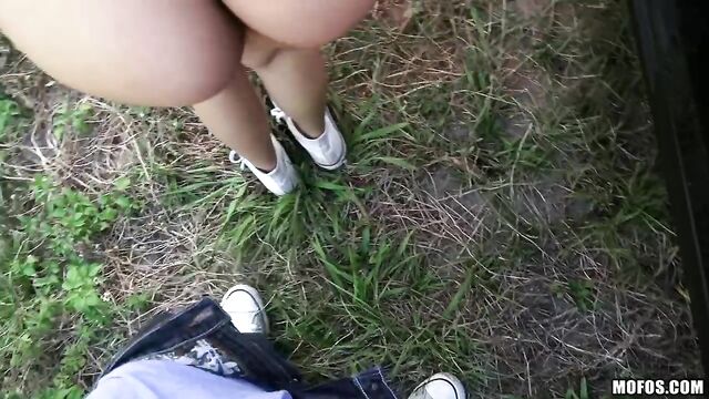 Description: Wild ebony party gal Maya Bijou knows how to get to the festival on time! This tutu-wearing rave chick shakes her booty for a ride, then thanks the driver by flashing her tits, then deepthroating and riding his big cock in a public field!