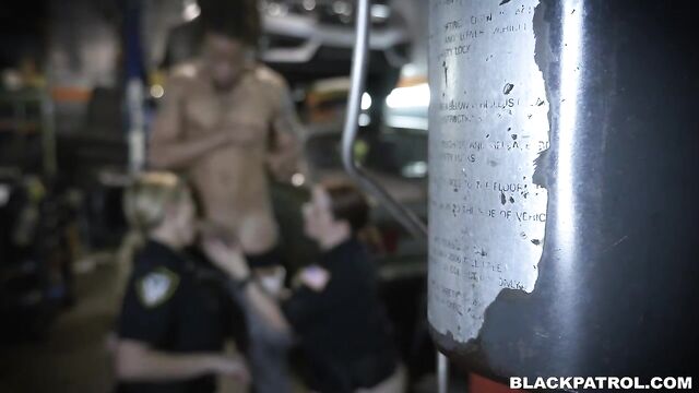 Description:We’ve been waiting around all week for this. A local Chop Shop we knew that was operating in the neighborhood finally was illegally chopping up stolen cars in the back lot of Overtown. When the judge finally issued the warrant, we knew it was time to act. We showed up when they were busy to make sure they didn’t see us coming. When we showed up they were in shock. One man claimed he didn’t speak English so we let our Spanish speaking officers take him in. Leaving us with the shops owner. He was tall slender black man with dreads, Me and officer Green knew we had something here. So After inspecting the shop and determining that the cars were in fact all stolen. We gave him the only choice he can make. He had to suck my pussy. That nappy headed criminal did his best, then he sucked my tits like a baby. We strip searched him and found that he was hot and packing heat. So we quickly sucked him off and then me and officer Green took turns riding that dick. When he came. We cleared him of all charges.