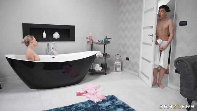 Description: College exchange student Jordi has just arrived and is horny for his host, the sexy Isabelle Deltore. He snaps a sneaky photo of her tits to jerk off to in the bathroom, but she accidentally walks in on him in the act. Embarrassed, he leaves the bathroom to her, but stays behind the door, peeping on her while she gets ready for her bath. Isabelle knows what college guys are like, and decides to put on a show for Jordi, who she knows is spying. It isn’t long before she invites him in to give her a massage, and he can’t help but get hard again when he sees her wet tits bobbing in the sudsy water. Isabelle’s spa night becomes bathtime for two, and she and Jordi soon end up fucking all over the bathroom!
